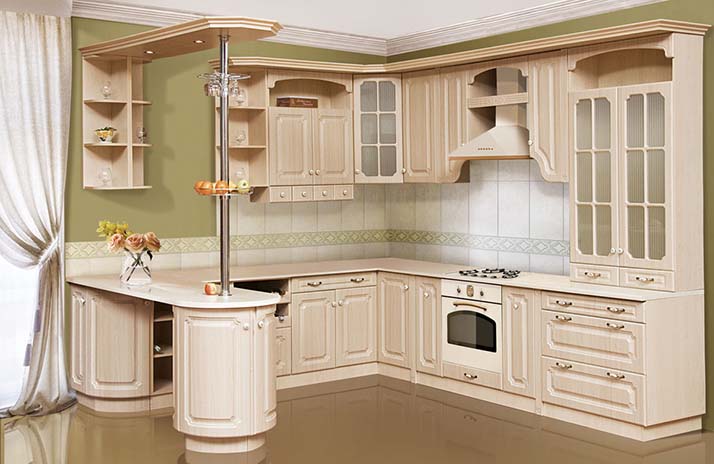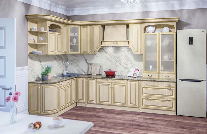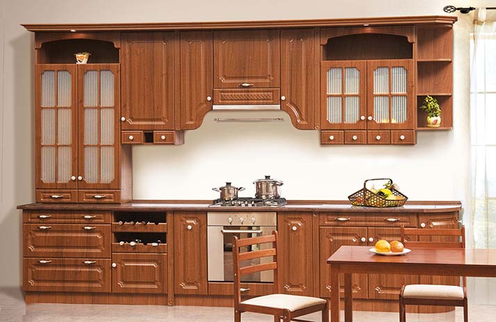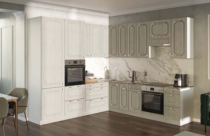 Frontalni dijelovi kuhinje su izrađeni od MDF-a u svijetlo sivoj boji supermat tekstura, te boji kamenog hrasta,